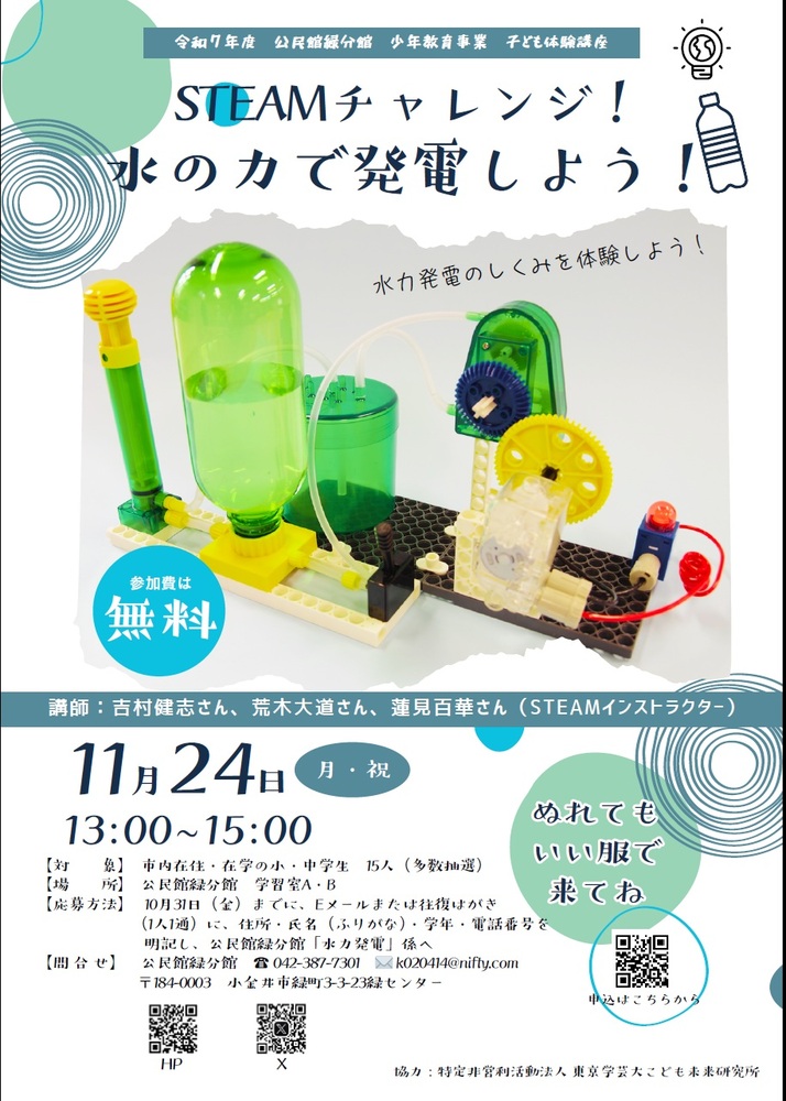 公民館緑分館 子ども体験講座 「STEAMチャレンジ!水の力で発電しよう!」を開催します