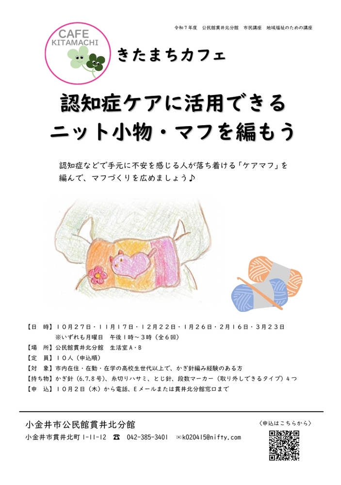 公民館貫井北分館 市民講座「きたまちカフェー認知症ケアに活用できるニット小物・マフを編もう」を開催します