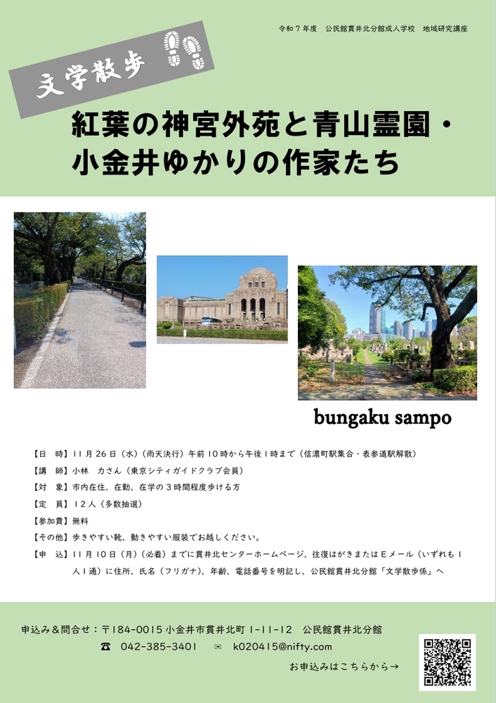 公民館貫井北分館 成人学校 地域研究講座 文学散歩「紅葉の神宮外苑と青山霊園・小金井ゆかりの作家たち」を開催します