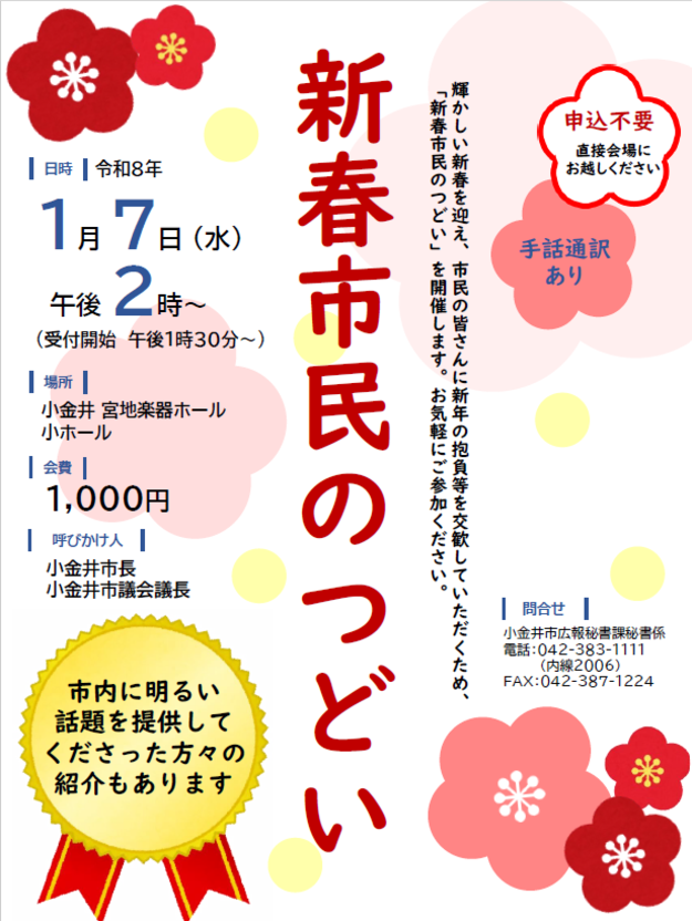 輝かしい新春を迎え、市民の皆様に新年の抱負等を交歓していただくため「新春市民のつどい」を開催します。お気軽にご参加ください。
