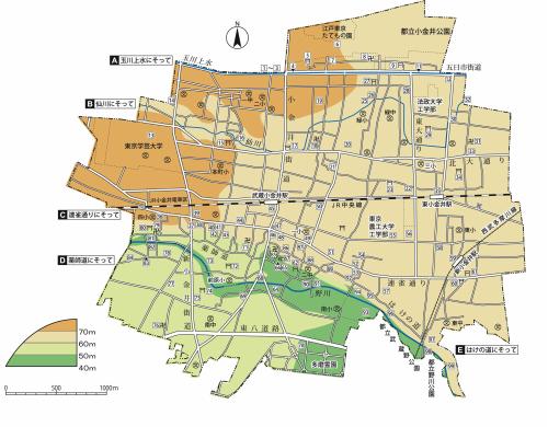 実際に市内めぐりをする時の便を考え、「A 玉川上水にそって」、「B 仙川にそって」、「C 連雀通りにそって」、「D 薬師道にそって」、「E はけの道にそって」の5コースに分けて掲載しています。