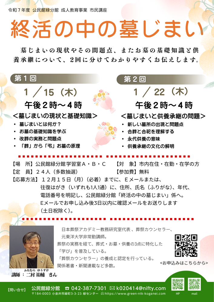 令和7年12月15日(月曜)(必着)までに、往復はがきまたはEメール(いずれも1人1通)に住所・氏名(ふりがな)・年代・電話番号を明記し、公民館緑分館「終活の中の墓じまい」係へ