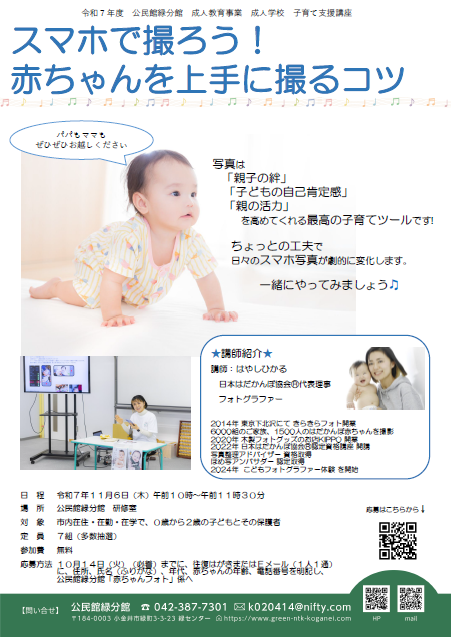 令和7年10月14日(火曜)(必着)までに、往復はがきまたはEメール(いずれも1人1通)に、住所・氏名(ふりがな)・年代・赤ちゃんの年齢・電話番号を明記し、公民館緑分館「赤ちゃんフォト」係へ