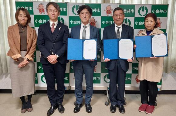 左から古橋副市長、白井市長、株式会社ルネサンス様、小金井市商工会様、特定非営利活動法人エンゼルの会様