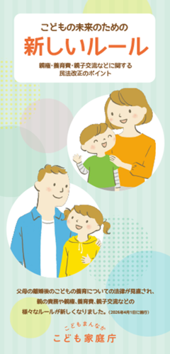 この法律は、子どもの養育に関する父母の責任を明確化するとともに、親権・監護、養育費、親子交流等に関する規定を見直すもので、令和8年4月1日に施行されます。