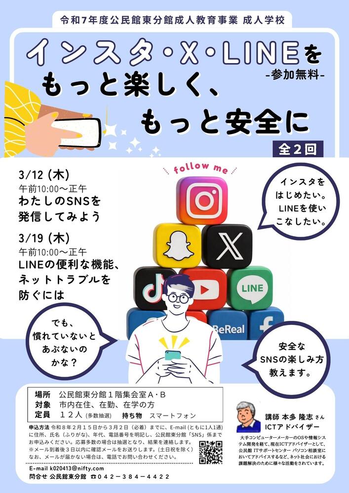 公民館東分館 成人学校「インスタ・X・LINEをもっと楽しく、もっと安全に」を開催します