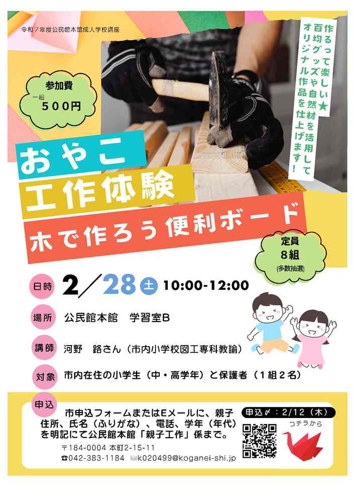 住所・氏名(ふりがな)・年代・電話番号を明記し、公民館本館「親子工作」係