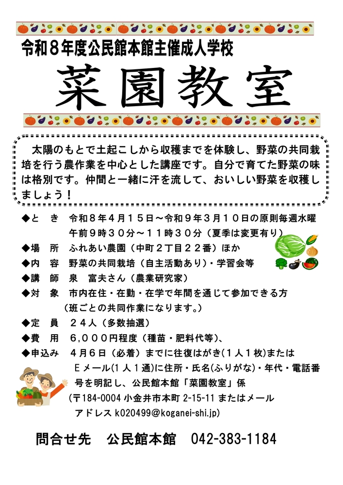 (ふりがな)・年代・電話番号を明記し、公民館本館「菜園教室」係