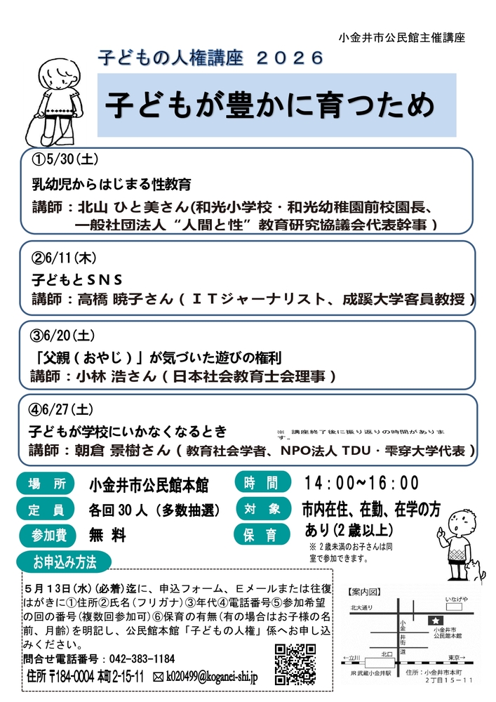 令和8年5月13日(水曜日)(必着)までに、申込フォーム、Eメールまたは往復はがきに住所、氏名(ふりがな)、年代、電話番号、参加希望の回の番号(複数回参加可)、保育の有無(有の場合は、お子様の名前及び月齢)を明記し、公民館本館「子どもの人権」係へお申し込みください。