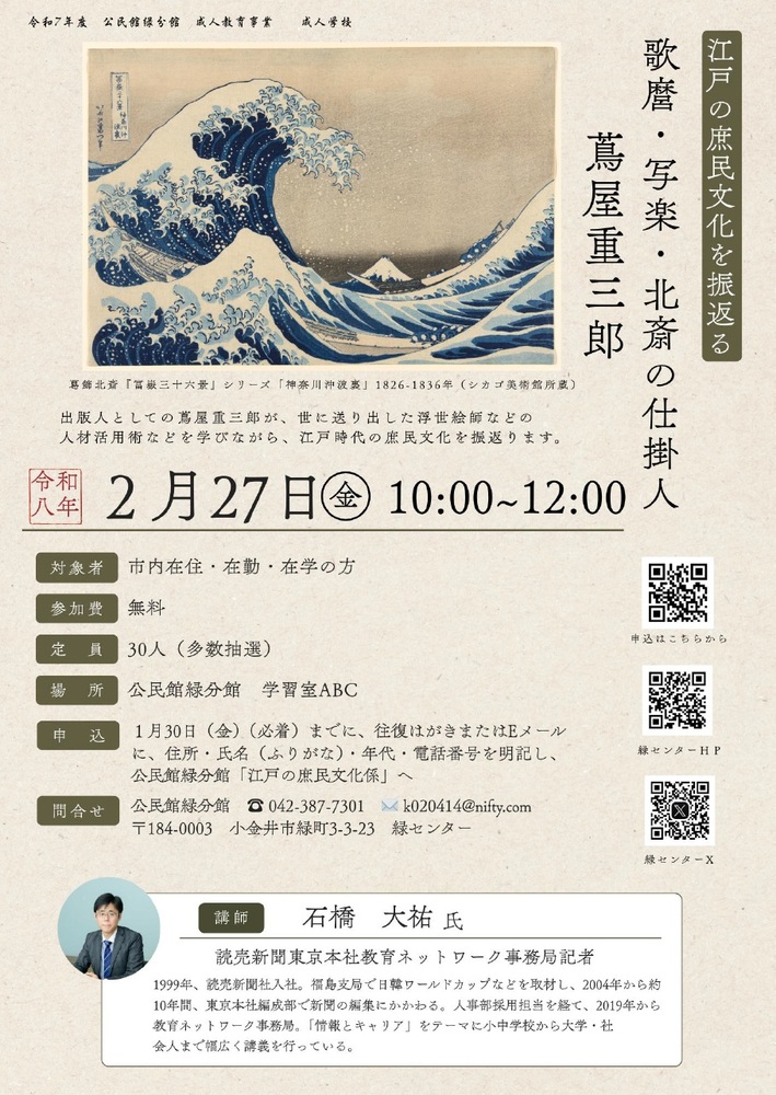 公民館緑分館 成人学校「江戸の庶民分館を振返る―歌麿・写楽・北斎の仕掛人 蔦屋重三郎」を開催します