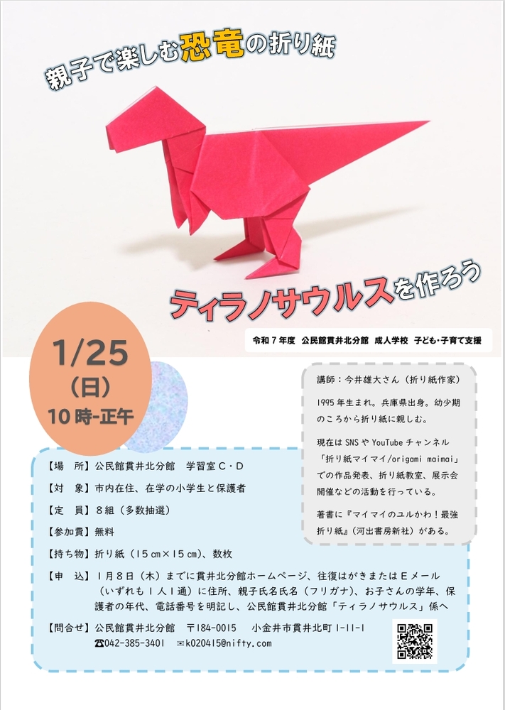 公民館貫井北分館 成人学校 子ども・子育て支援「親子で楽しむ恐竜の折り紙−ティラノサウルスを作ろう」を開催します