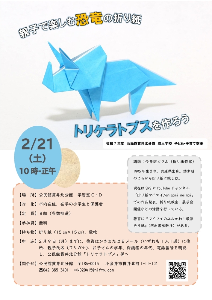 公民館貫井北分館 成人学校 子ども・子育て支援「親子で楽しむ恐竜の折り紙−トリケラトプスを作ろう」を開催します