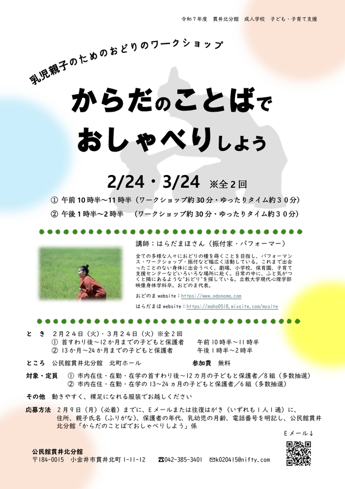 公民館貫井北分館 成人学校 子ども・子育て支援「乳児親子のためのおどりのワークショップ からだのことばでおしゃべりしよう」を開催します