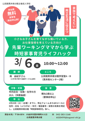 令和8年2月24日(火曜日)(必着)までに、市申込フォームまたは往復はがき、メール(1人1通)に、住所・氏名(ふりがな)・年代・電話番号・保育の有無を明記し、公民館貫井南分館「時短家事育児」係(〒184‐0014 小金井市貫井南町4丁目3番23号または下記お問い合わせのメールアドレス)へ。申込フォームご利用の場合は、講座案内チラシ内の2次元コードまたは下記URLへ。