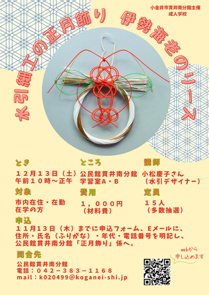 令和7年11月13日(木曜日)(必着)までに、市申込フォームまたは往復はがき、メール(連名不可 注記:親子参加の場合は1枚1組)に、住所・氏名(ふりがな)・年代・電話番号を明記し、公民館貫井南分館「正月リース」係(〒184‐0014 小金井市貫井南町4丁目3番23号または下記お問い合わせのメールアドレス)へ。