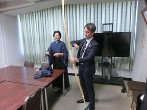 ご自身の弓をご持参くださいました。弦が想像以上に固く、市長も驚いていました。