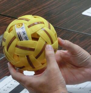 ボールをご持参くださいました。新しいボールは想像以上に固く、使用することで徐々に柔らかくなるそうです。