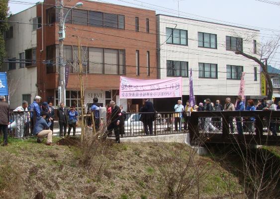記念樹のヤマザクラの苗木は、国史跡玉川上水に架かる平右衛門橋のたもとに植えられ、青空の下、植樹式が盛大に行われました。
