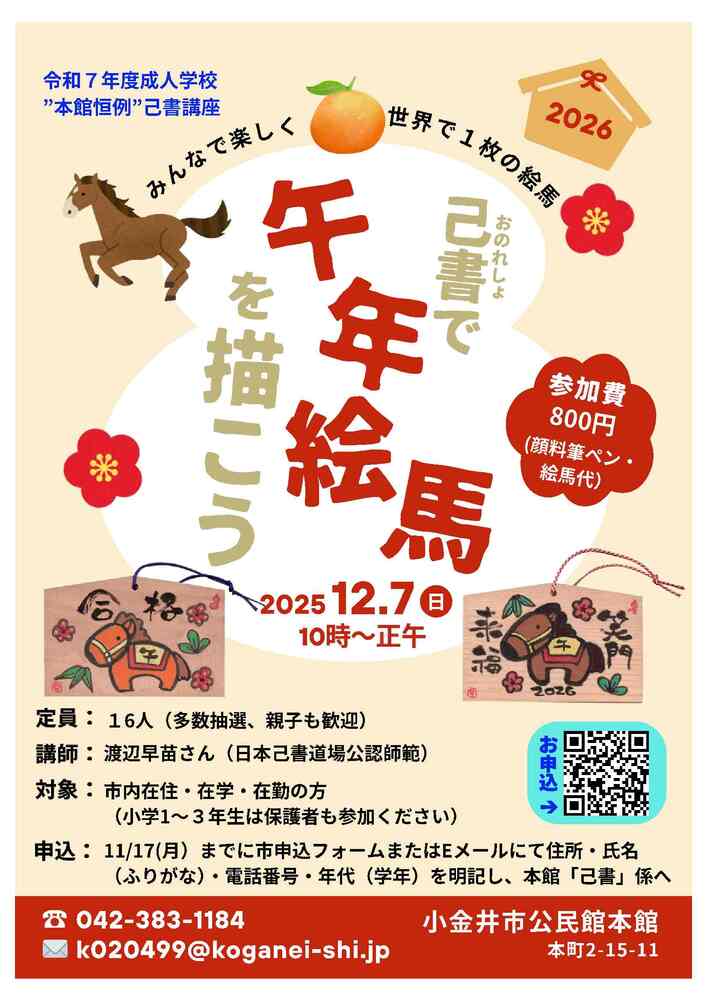 住所・氏名(ふりがな)・年代・電話番号を明記し、公民館本館「己書」係