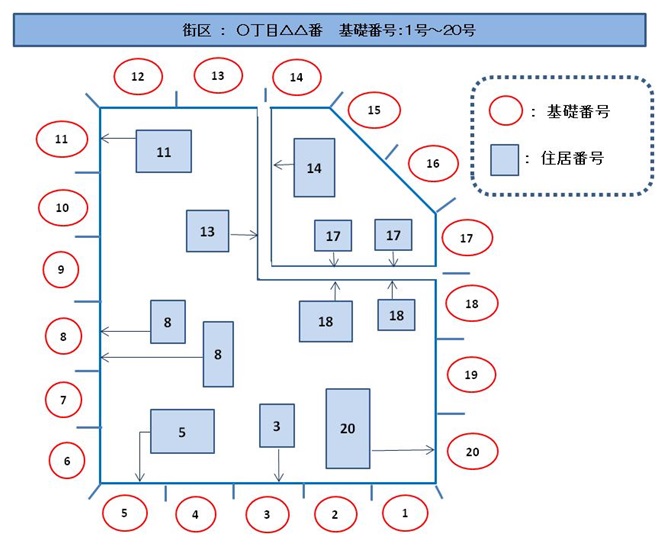 街区(○丁目△△番)を取り巻くように基礎番号が一定の間隔(おおよそ10~15メートル)でつけられており、住居番号(□□号)は建物の主要な出入口が面している基礎番号をもって付番しています。
