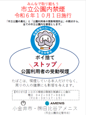 喫煙者に対しましては、令和6年4月1日から全ての市立公園の管理をしている指定管理者の巡回時に、巡回スタッフがお声掛けさせていただきますので、ご理解、ご協力をお願いします。