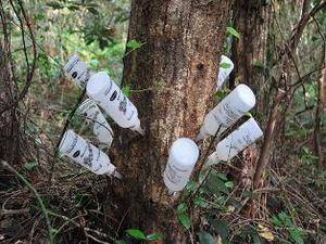 アンプルの底部に穴をあけ自然圧で殺菌剤の注入(出典 林野庁)
