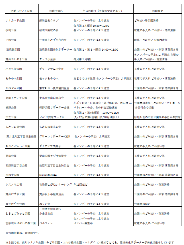 これらの公園以外にも、市内各公園や緑地で公園内のごみ拾いなどボランティアにて活動されている方々もたくさんいらっしゃいます。