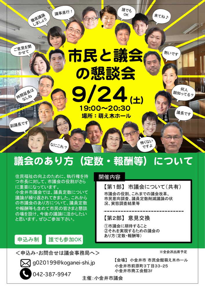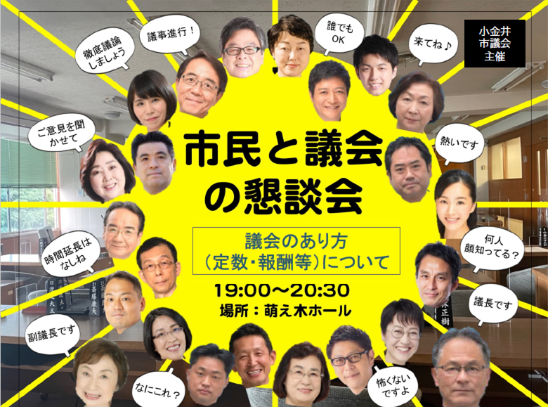 小金井市議会では、議員定数について議論が繰り返されてきました。これからの市議会のあり方について、議員定数や報酬等も含めて市民の皆様と懇談の場を設け、今後の議論にいかしたいと思います。ぜひご参加ください。